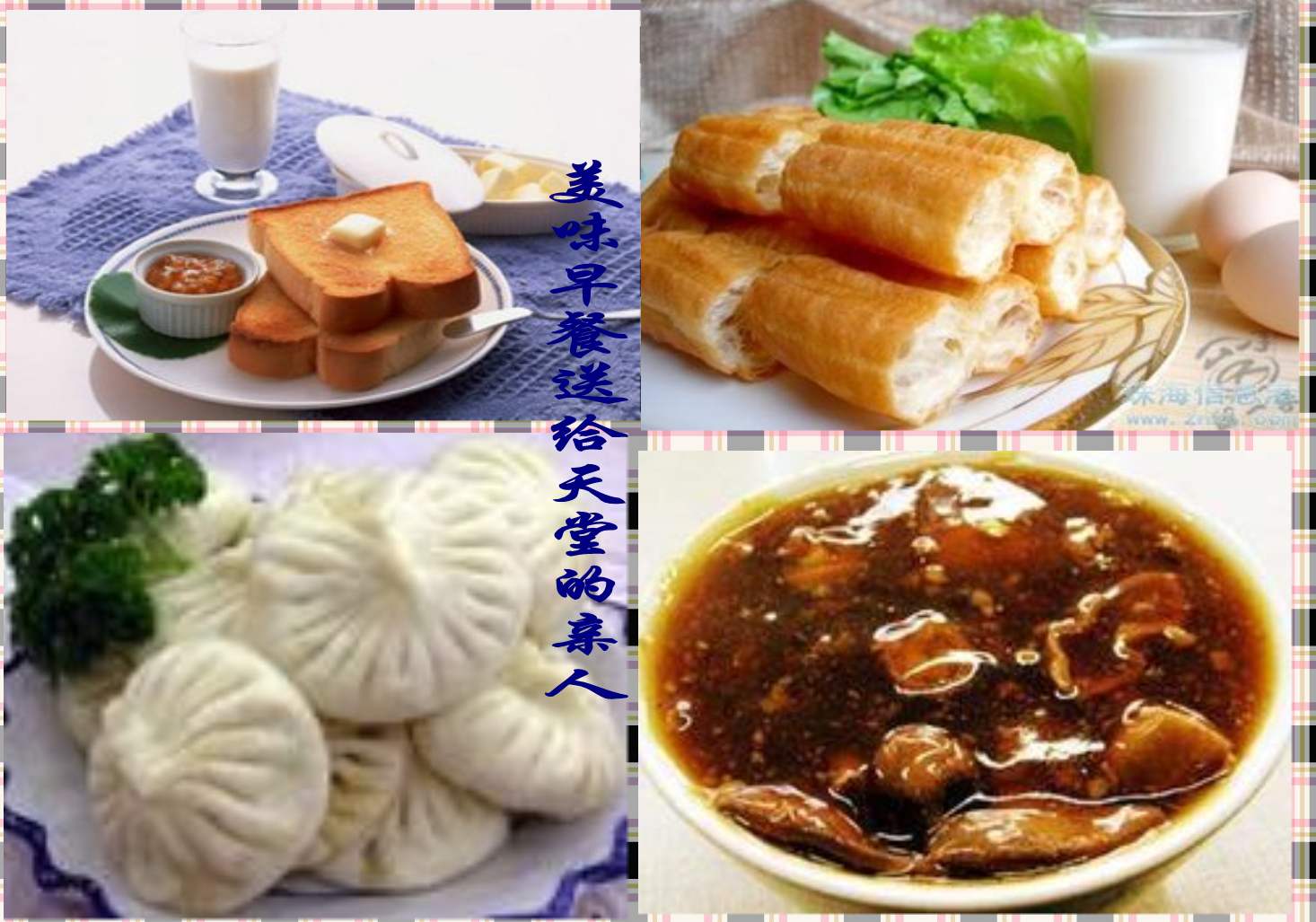 儿子,早餐好了,待会儿自己用餐噢,妈妈腰腿疼,要适当的动一动,就不陪你了。