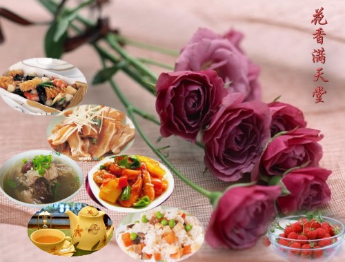 鲜花和美食与儿子分享。